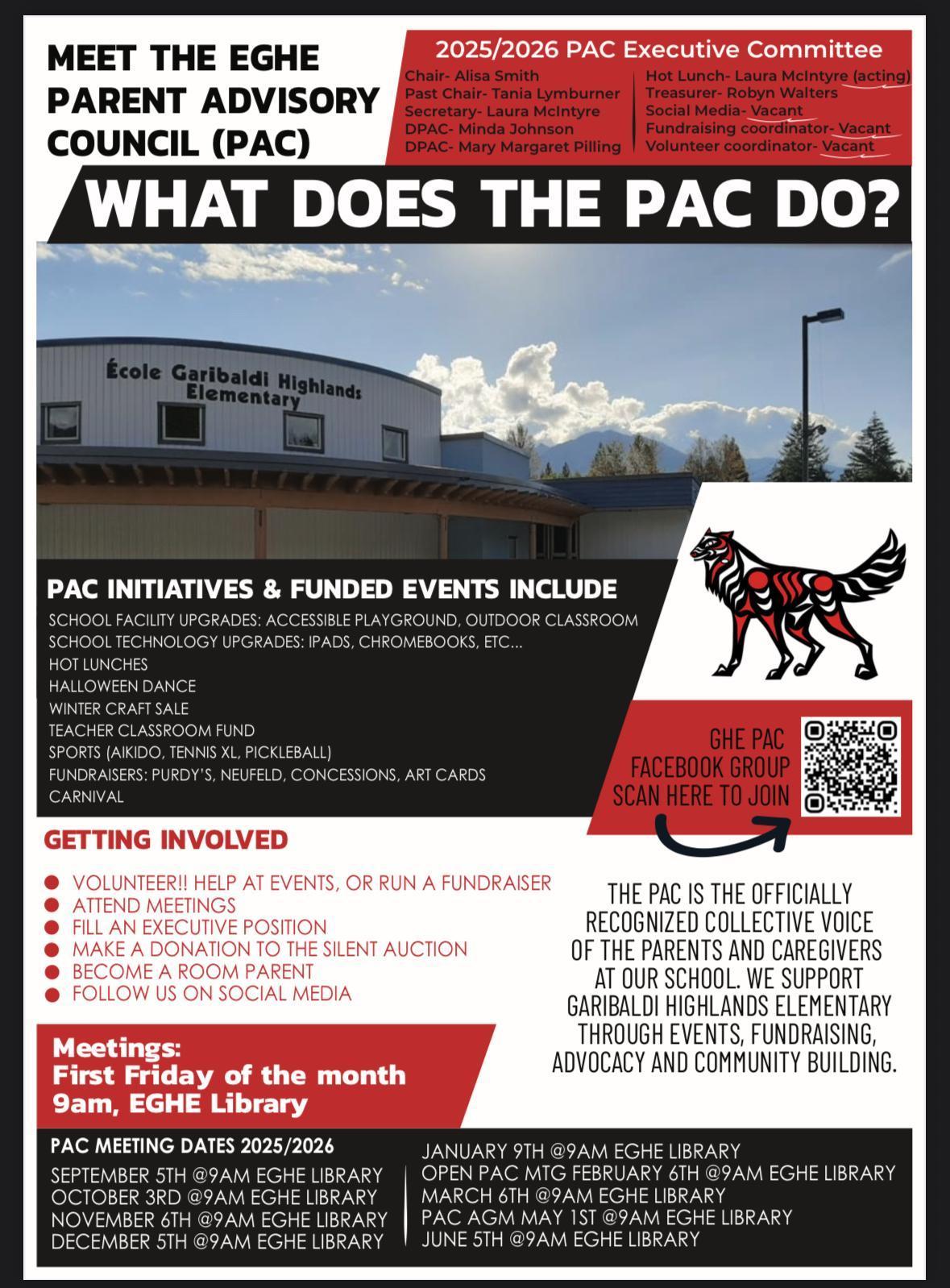 The Parent Advisory Council (PAC) warmly welcomes you to our school's website. We are hopeful that this platform will significantly improve communication among parents, teachers, and staff. We invite you to navigate through the site, make frequent visits, and share your feedback to help us improve it further. Every parent is a vital member of our PAC, and the individuals listed below are your representatives. Feel free to reach out to any of our members with your questions, concerns, or suggestions on how we can enrich the educational journey of our students at Ecole Garibaldi Highlands Elementary School. Your input is highly anticipated!